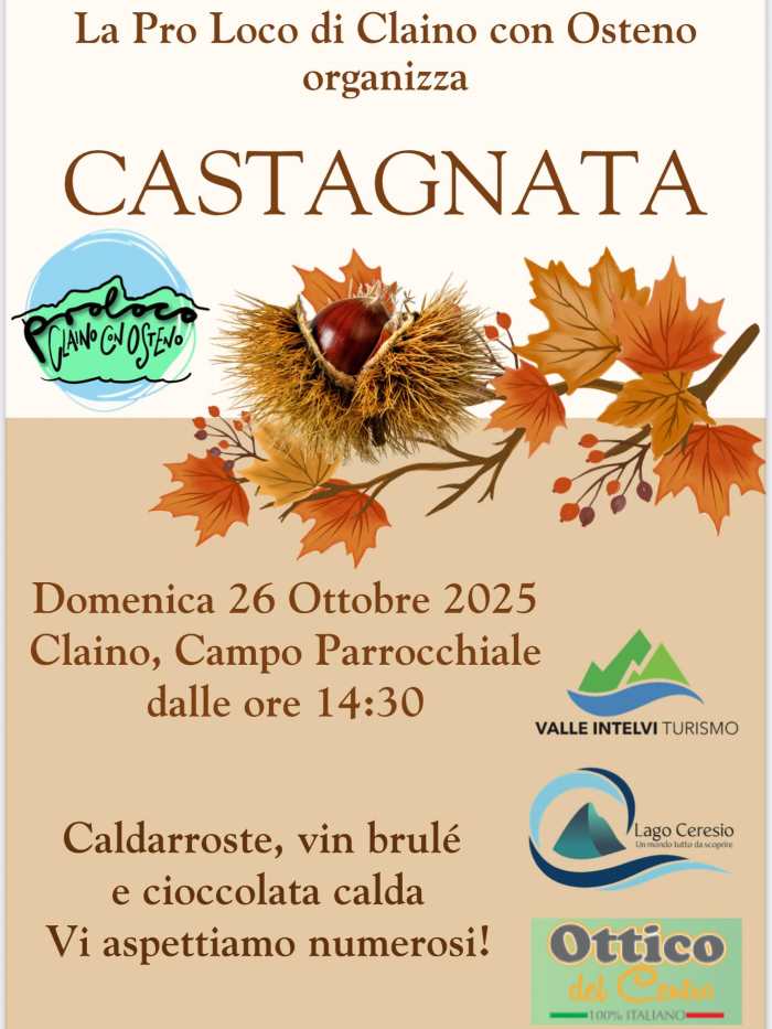 La Pro Loco di Claino con Osteno organizza Castagnata domenica 26 ottobre 2025 ore 14:30 presso il campo parrocchiale a Claino.